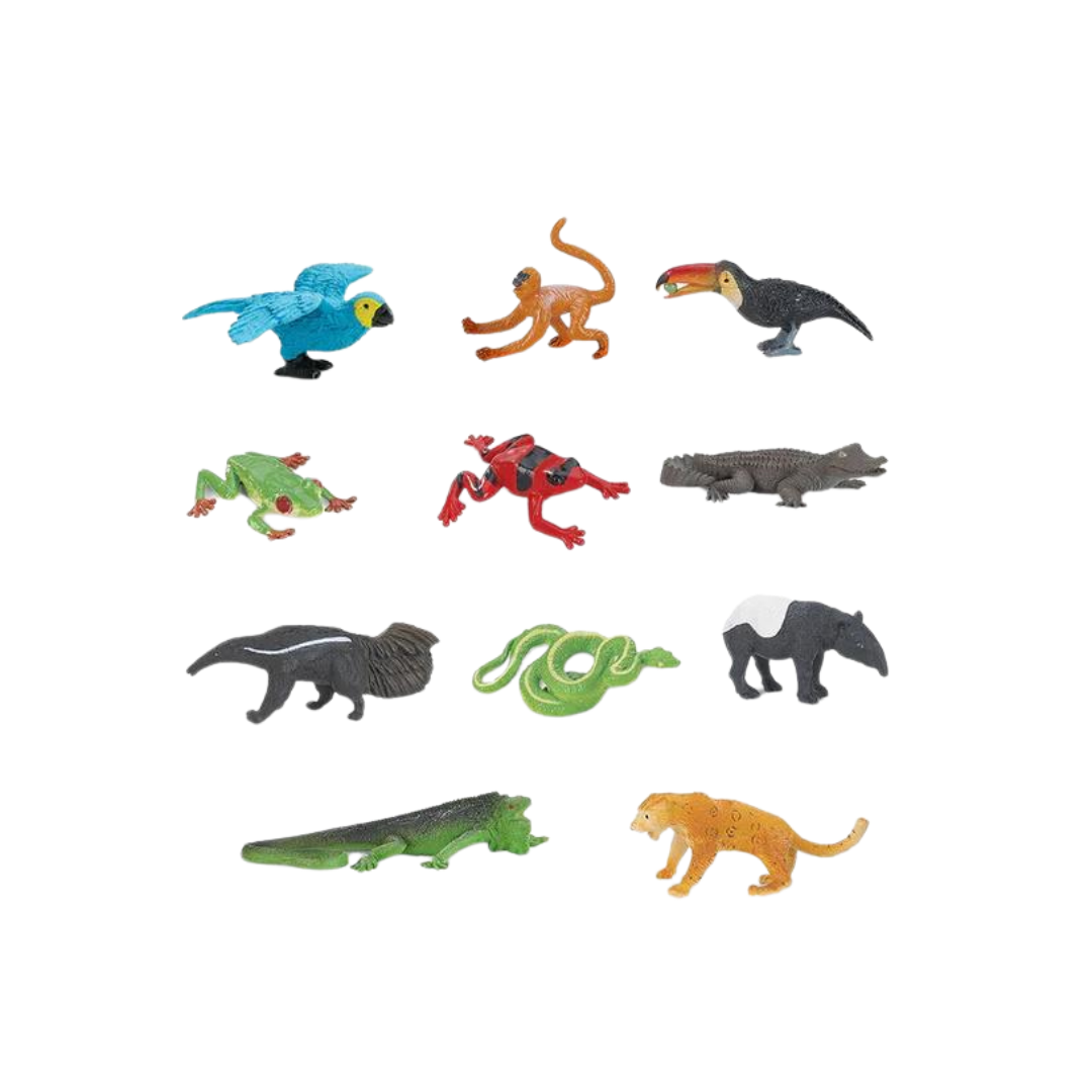 Este set contiene 11 figuras en miniatura de animales que habitan los bosques tropicales. Se recomienda su uso bajo la supervisión de un adulto.