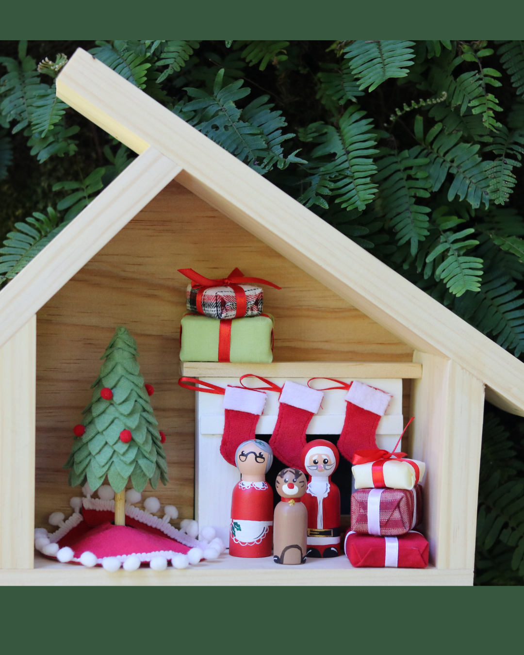 Incluye: Casa, Santa Claus, Señora Claus, Rodolfo, árbol, alfombra, chimenea, leña, botas y regalos