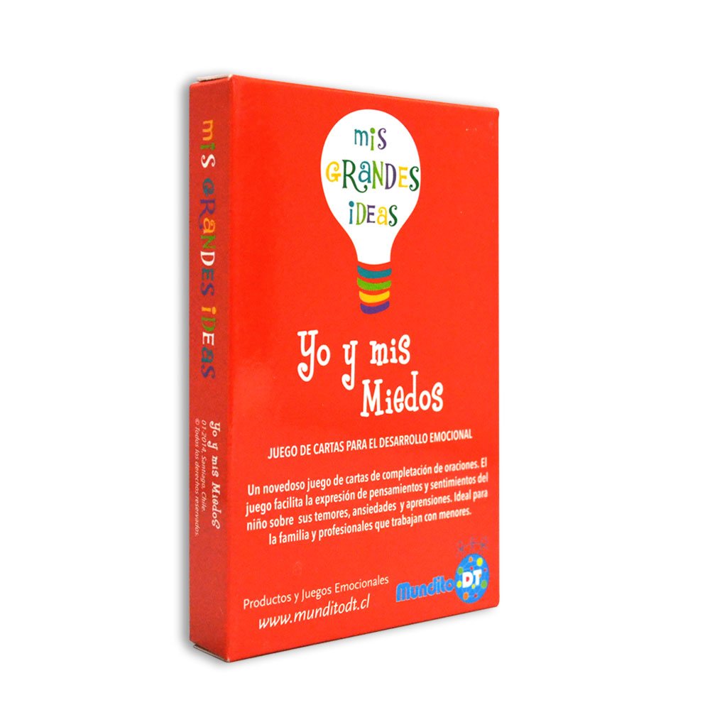 Un novedoso juego de cartas de completación de oraciones que facilita la expresión de pensamientos y sentimientos del niño sobre sus temores, ansiedades y aprensiones. Herramienta ideal para padres y profesionales que trabajan con menores. El juego contiene 36 cartas (en español e inglés) que abarcan variadas temáticas relacionadas con los miedos, incluyendo ansiedad, sentimiento de inseguridad, timidez y preocupaciones. A través del juego el adulto podrá facilitar la identificación y comprensión de los miedos que afectan al niño, y comenzar a intervenir en su mejor manejo y resolución.
